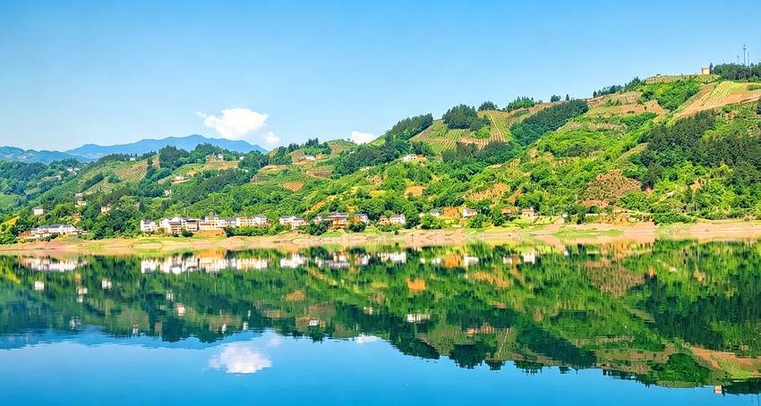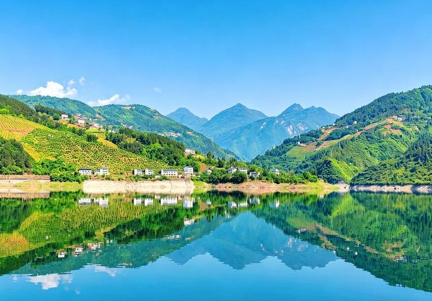 三峡库区蓄水后,沿渡河镇的罗坪形成一片澄澈开阔的天然湖泊,与神农溪水域浑然相融,湛蓝天空下,连绵青山环绕着碧绿水面,岸边白墙民居错落有致,清晰的倒影在如镜的水中铺展,与葱郁林木相映成趣,尽显生态之美。