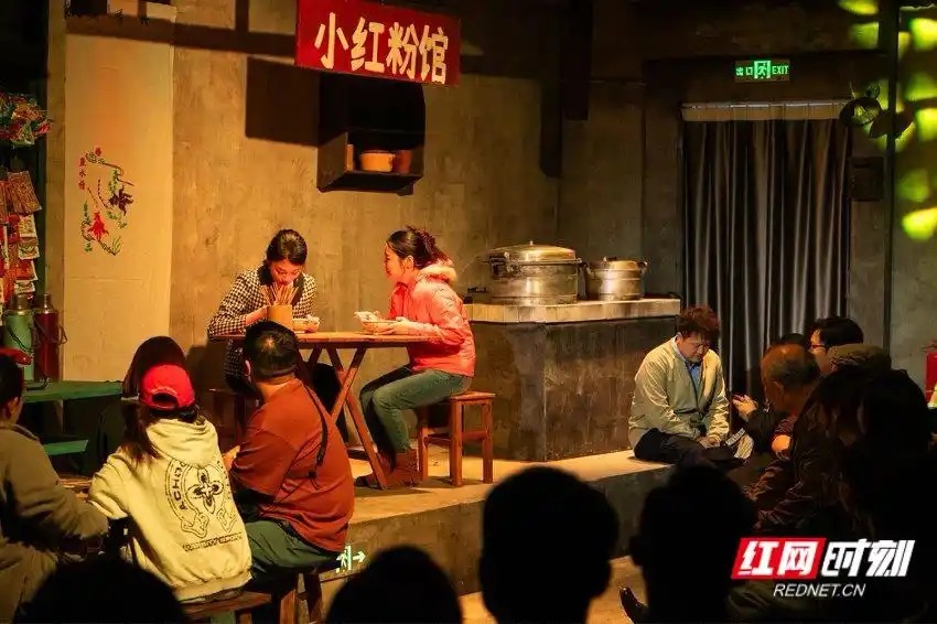 演出现场。然而,友情与爱情、利益与误会,让最铁的兄弟反目成仇,在商海搏杀中彼此撕扯了二十年。与此同时,胡大姐和民警老王长达数十年的默默相守,他们的儿女胡闹与小红那鸡飞狗跳却又离不开彼此的婚姻,都在同一个院子里静静/span>观众可以坐在竹椅上听他们“策谈”,邂逅一段段人生,零距离见证所有欢笑与泪水。演出中随时可能被演员拉入剧情:被邀请上台扮演一个临时角色,或是和主角坐在一起围观街坊邻居“扯皮”。那一刻,你不再是看客,而是真的成了老街里的一员。值得一提的是,导演没有使用幕布和道具搬运,仅凭灯光明暗变化与演员走位,自然引导观众的视线。灯光打亮粉店,视线便随老板娘下粉;灯光转暗再亮,歌厅灯球旋转,时光已悄然过去数年。观众无需挪步,只需转动目光,就能在同一空间里看到不同时空的故事线交错展开,走进这条会呼吸的老街,见证剧中人与长沙城的共同成长。